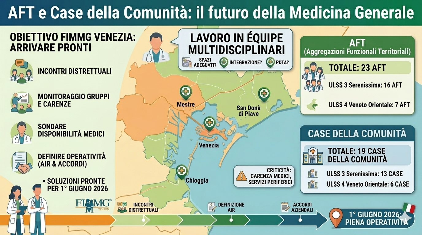 Arrivare con soluzioni pronte al momento in cui saranno pienamente operative da un lato le Aggregazioni Funzionali Territoriali (AFT) e dall'altro le Case della Comunità, indicativamente a partire dal primo giugno 2026. Questo l’obiettivo che ha spinto FIMMG Venezia a organizzare una serie di incontri on line o in presenza, declinati distretto per distretto, con i medici di famiglia e i referenti delle aree: il prossimo è in programma mercoledì 29 aprile per l’area che raccoglie Vigonovo, Fiesso, Stra e Campagna Lupia. Il segretario Palmisano: «Dobbiamo arrivare pronti».